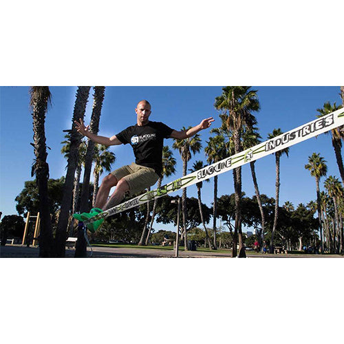 Custom-designed trampoline-style webbing is made for slacklining and provides extra bounce for dynamic tricks