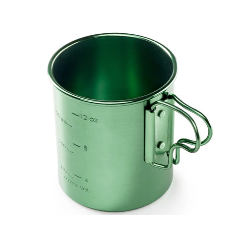 This ultra-lightweight camping and hiking cup made of high-grade aluminum features folding handles and stamped-in graduations.
