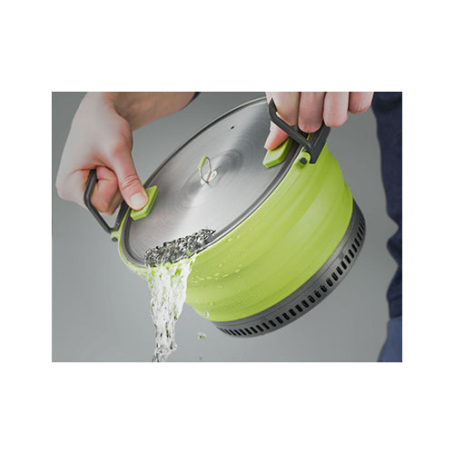 Cook more, carry less. The Escape HS pot combines a collapsible silicone body that takes up takes up 53% less space in your pack with our hyper-conductive anodized base that speeds cook times by up to 30% - that means you eat sooner and cut fuel use. The lid doubles as a strainer and has silicone pads at its grip points to help avoid burns. Graduations molded into the silicone pot body make measuring easy, dual handles make handling easy and fold out of the way for travel. The frypan has a non-stick coating that reduces mess and fuss, and an efficient even-heating design, and everything nests together in a compact storage bag.