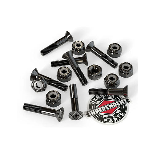 Independent Genuine Parts hardware is specified to the highest standards. Each set contains 6 black bolts and 2 red bolts. Genuine Parts Phillips hardware features cross logo heads, full size nylon lock nuts, full size bolt heads with Cross insignia, and extended unthreaded shafts for minimal board damage. Available in black, silver, gold and red. 1.25" and & 1.5". Updated packaging features 100% recyclable bolt bags.