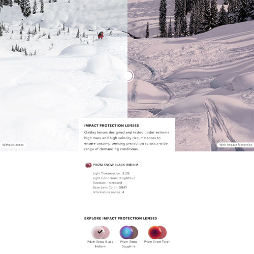Oakley lenses designed and tested under extreme high mass and high velocity circumstances to ensure uncompromising protection across a wide range of demanding conditions. Prizm Snow Black Iridium
