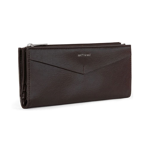 Folded wallet with a snap closure, zippered coin pocket, and card slots inside. All of the interior linings of Matt & Nat bags are made from 100% recycled plastic bottles. This company is completely vegan and cruelty-free.