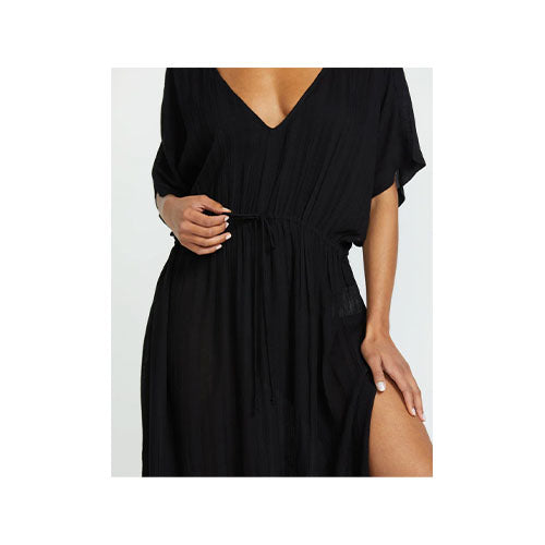 Our Billabong viscose swim cover-up midi with drop needle crinkle texture and relaxed fit makes flowing from beach to street stylish. V-neck with adjustable tie, logo metallic plate - flattering versatility. Featured here in the Black Pebble colorway.