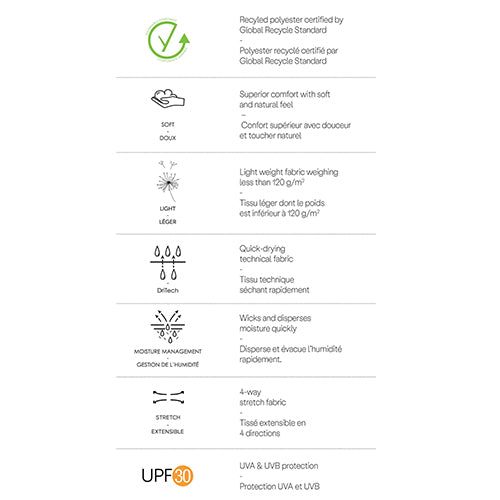 The KARUI ll short sleeve shirt is made of light woven fabric that offers comfort, lightness, softness and stretchability. The fabric dries quickly, has moisture wicking properties and has a UPF rating 30+. The KARUI ll has side slits that make the top even more confortable for an active journey. These features make this top versatile, great for travel and various outdoor activities.