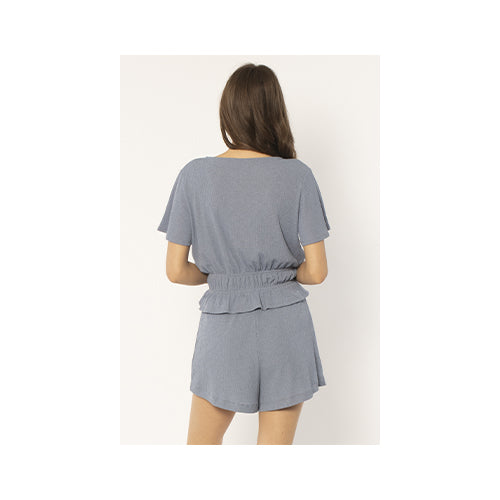 The Harlow Short Sleeve Knit Top is a texture rib cropped knit short flutter sleeve top with elastic waistline and a deep v neckline. It has a tie front closure and hook and loops at neckline.