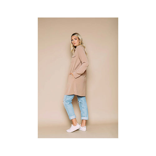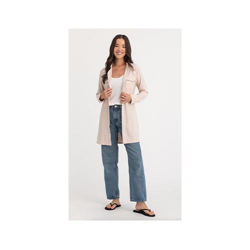 Our "shackets" always sell out in the Fall, so here is our take on a summer "shacket". Easy, breezy lightweight woven - you can use this as a summer lightlweight jacket but it's drapy enough to wear as a shirt dress too, so we added a self fabric belt.