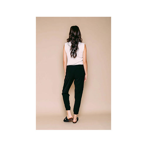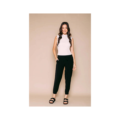 Casual jogger style in our breezy summer woven fabric. Features an elastic pull-on waist, front slash pockets and back patch pocket.
